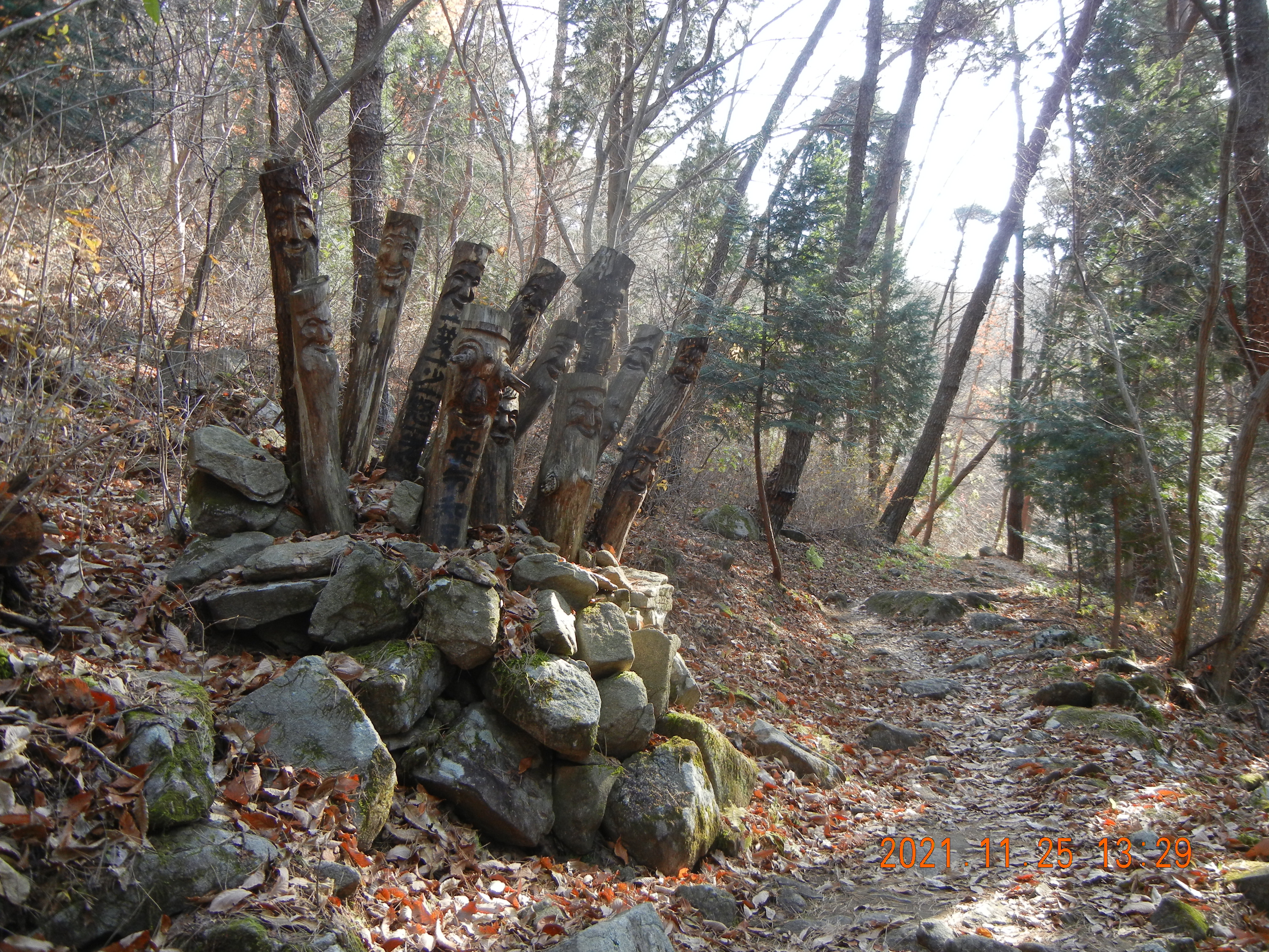 느재고개에서 측백숲길을 지나면 목장승군. 一笑一怒 (일소일노) 安分知足(안분지족) 등의 음각글씨가 보인다.
