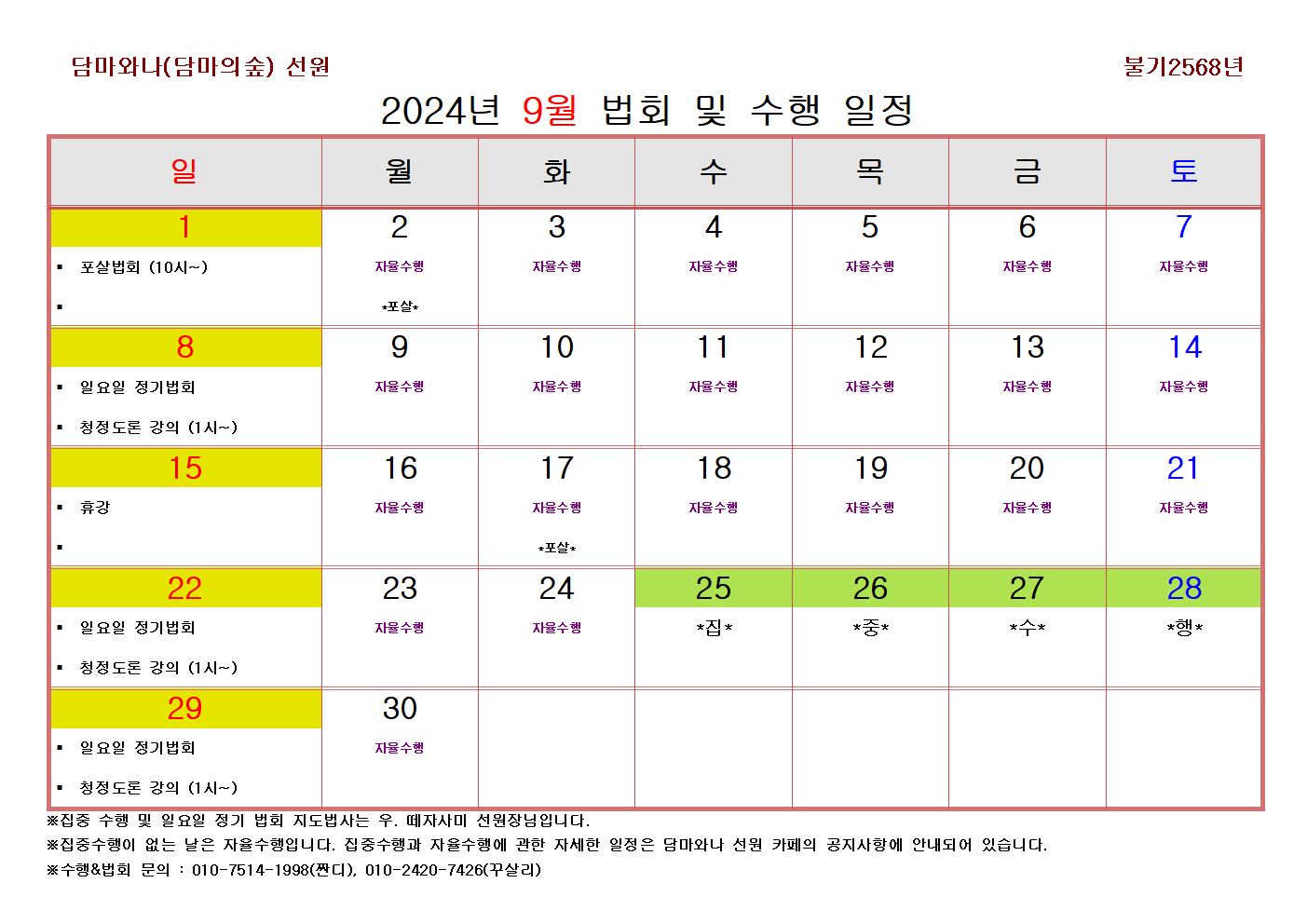 2024년 9월 법회 & 수행 일정안내 작성자짠디최광희|작성시간24.08.14|조회수182 목록 댓글 0 글자크기 작게가 글자크기 크게가 다음검색 현재 게시글 추가 기능 열기 북마크 공유하기 신고 센터로 신고 댓글 댓글 0 댓글쓰기 답글쓰기 댓글 리스트