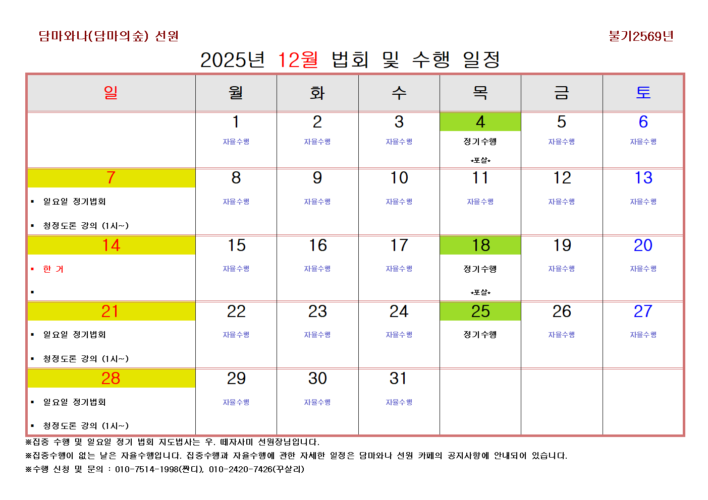 2025년 12월 법회 및 수행 일정표 안내 작성자짠디최광희|작성시간25.11.18|조회수141 목록 댓글 0 글자크기 작게가 글자크기 크게가 다음검색 현재 게시글 추가 기능 열기 북마크 공유하기 신고 센터로 신고 댓글 댓글 0 댓글쓰기 답글쓰기 댓글 리스트