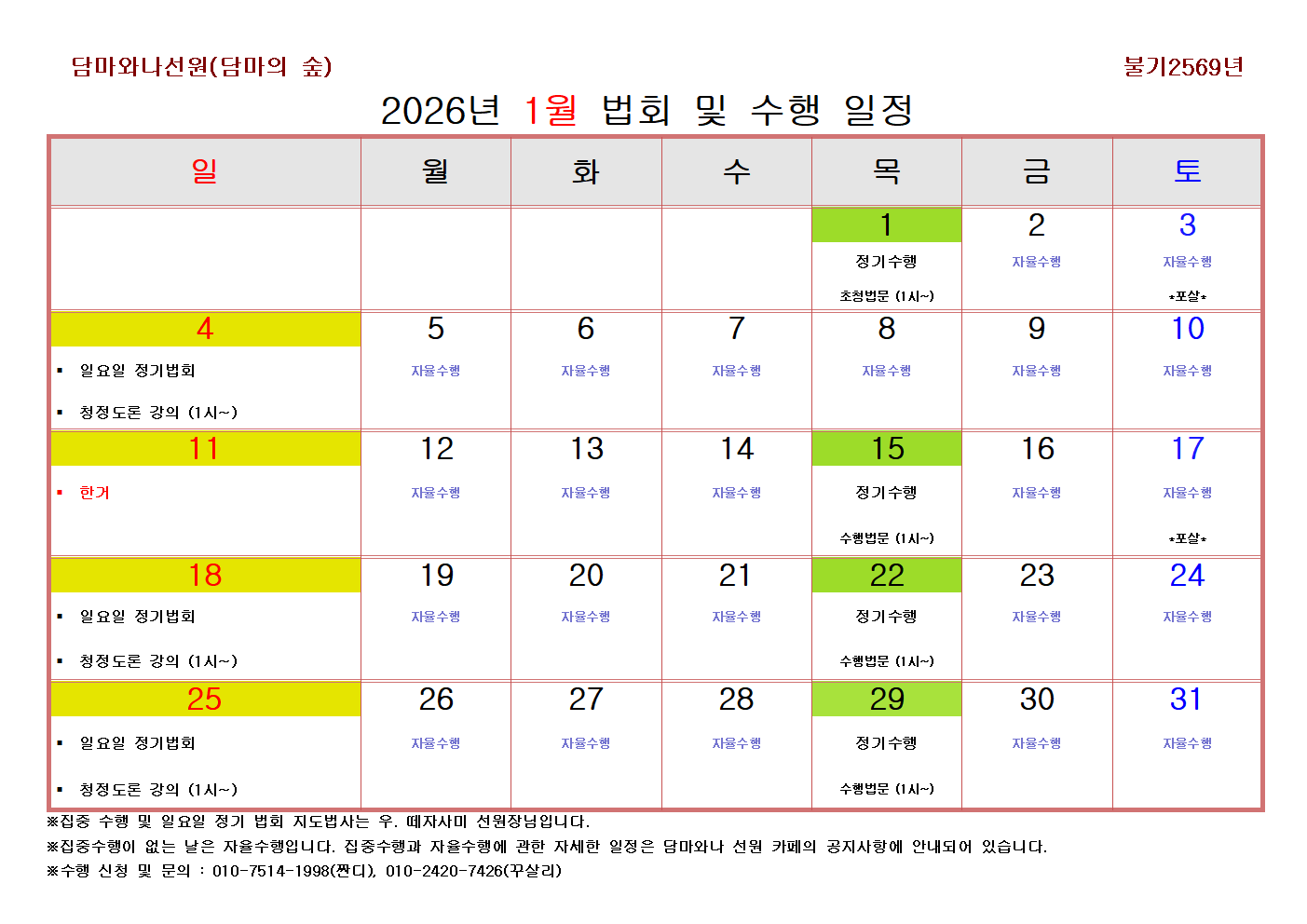 1월 11일 일요일 정기법회 휴강안내를 알려드립니다.