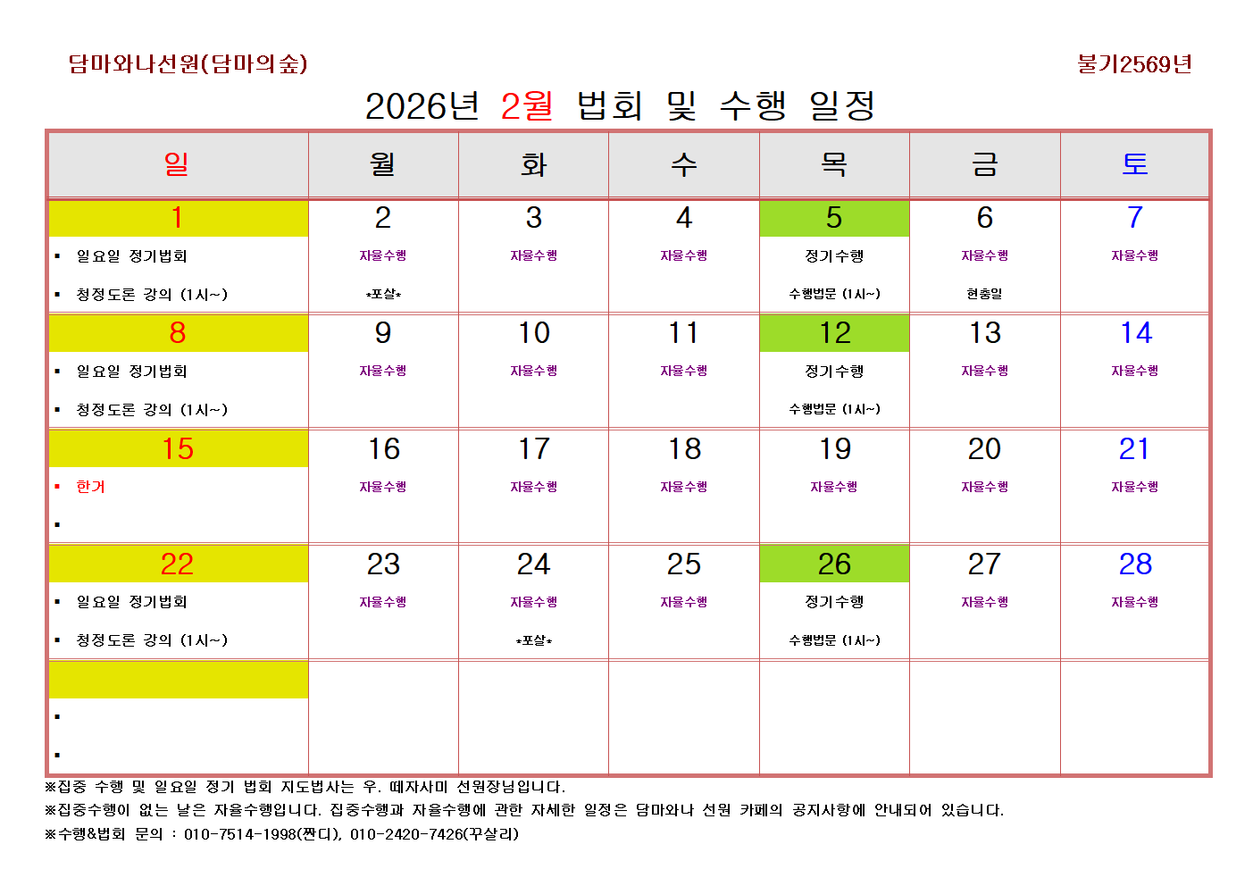 2026년 2월 법회 및 수행 일정표 안내 작성자짠디최광희|작성시간26.01.15|조회수123 목록 댓글 0 글자크기 작게가 글자크기 크게가 다음검색 현재 게시글 추가 기능 열기 북마크 공유하기 신고 센터로 신고 댓글 댓글 0 댓글쓰기 답글쓰기 댓글 리스트