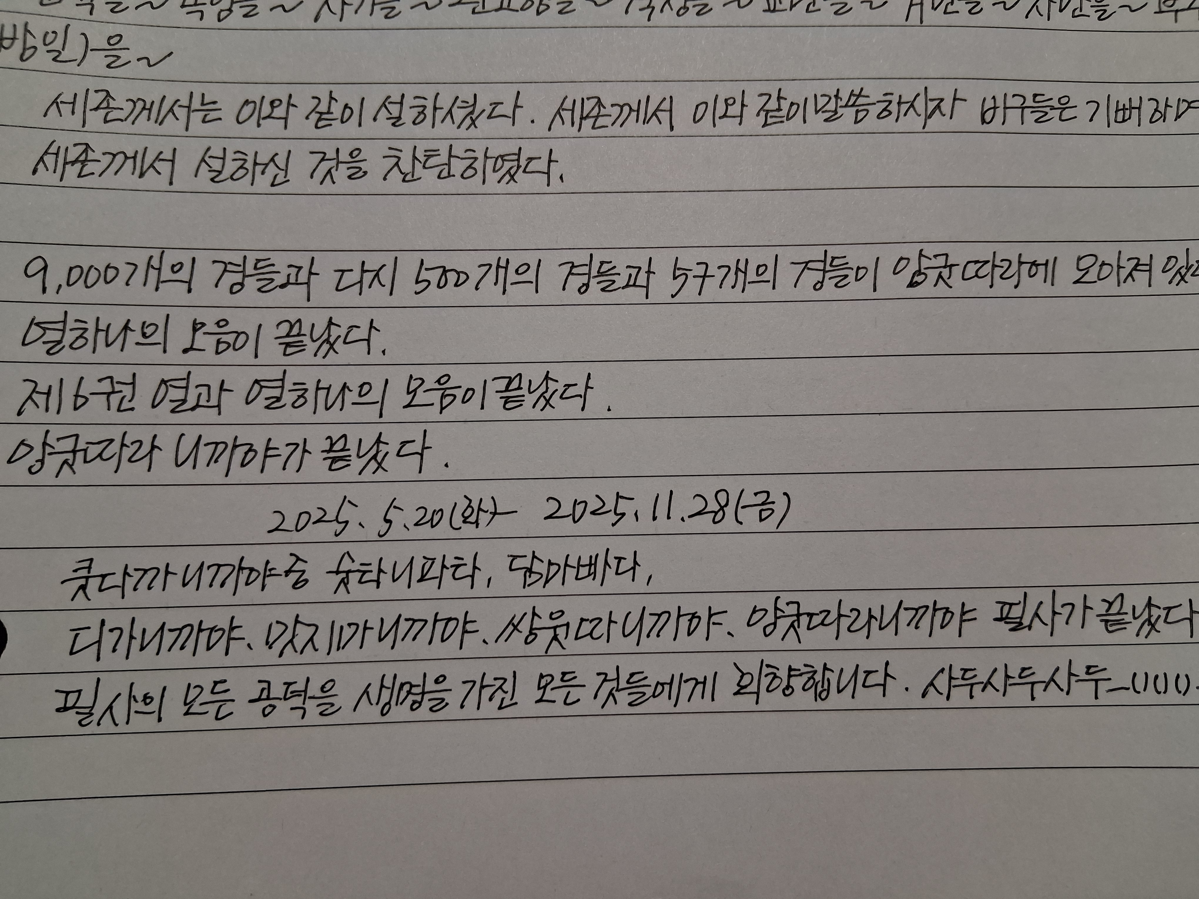 4부니까야 필사 마침 작성자너도바람|작성시간25.11.28|조회수24 목록 댓글 3 글자크기 작게가 글자크기 크게가 디가니까야맛지마니까야상윳따니까야앙굿따라니까야 4부 니까야 필사를 마쳤습니다. 3년 조금 덜 걸렸습니다. 이 모든 필사의 공덕을 생명가진 모든이에게 회향합니다 사두사두사두 _()()()_ 다음검색 현재 게시글 추가 기능 열기 북마크 공유하기 신고 센터로 신고 댓글 댓글 3 댓글쓰기 답글쓰기 댓글 리스트 작성자짠디최광희 | 작성시간 25.11.29 사두 !사두 !사두! 작성자떼자사미 | 작성시간 25.11.29 너도바람님4부 니까야 필사를 축하합니다.함께 기쁨을 나눕니다.사두사두사두 작성자마음문지기(박송주) | 작성시간 25.12.01 사두 사두 사두_(0)_ 댓글 전체보기