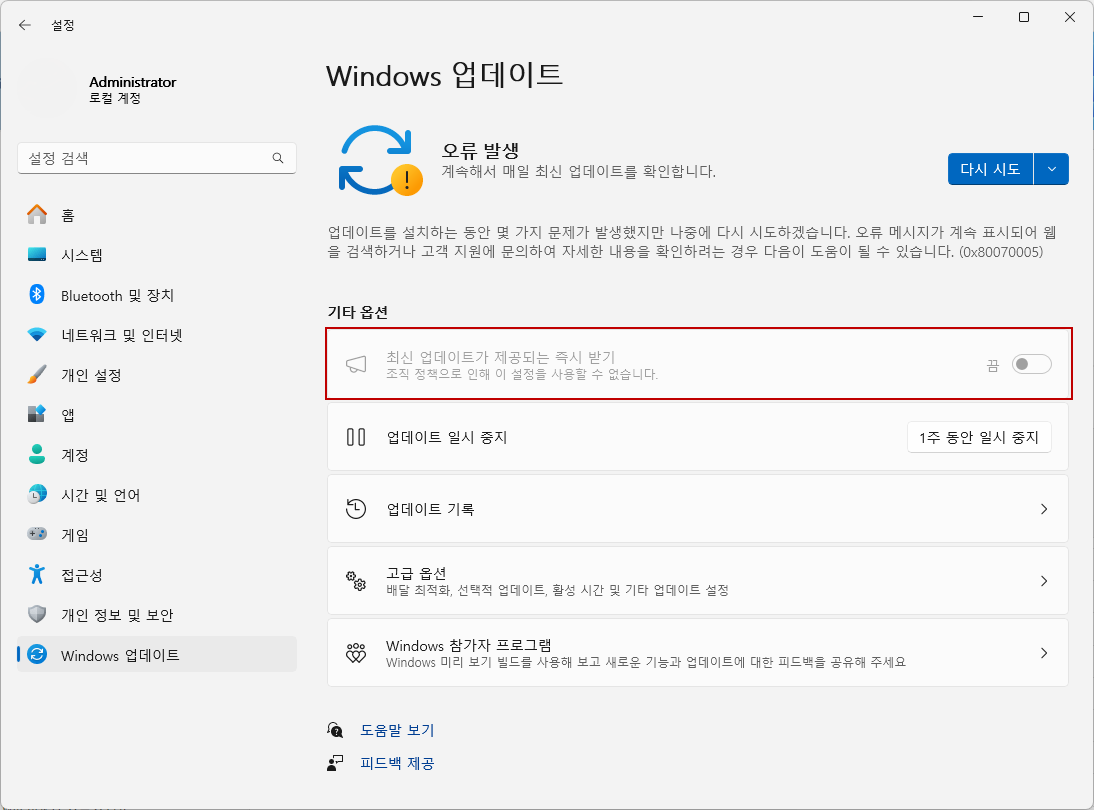 "최신 업데이가 제공되는 즉시 받기" 옵션 항목이 비활성화되어서 변경할 수 없을 때 사용하는 레지스트리 적용 방법입니다.