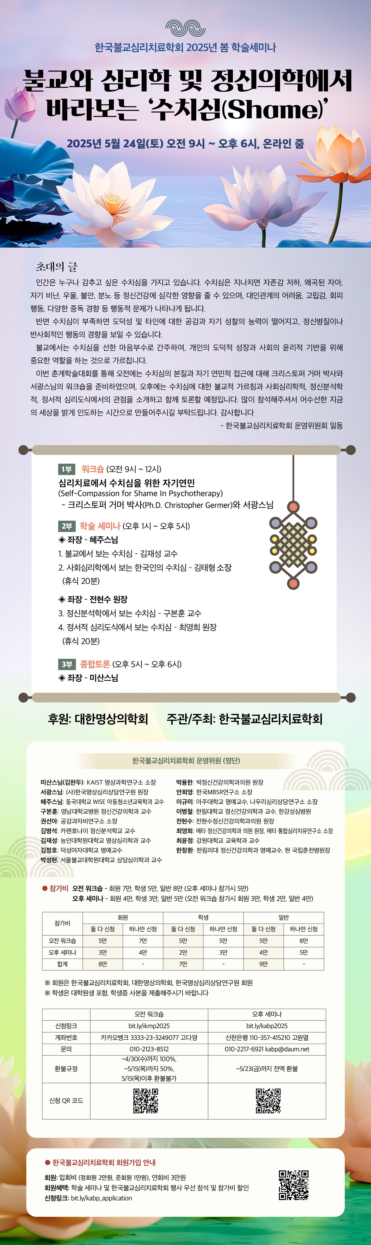 불교, 심리학 및 정신의학에서 바라보는 수치심(Shame) 세미나 안내 - 5.24토 작성자마몸|작성시간25.03.09|조회수35 목록 댓글 0 글자크기 작게가 글자크기 크게가 다음검색 현재 게시글 추가 기능 열기 북마크 공유하기 신고 센터로 신고 댓글 댓글 0 댓글쓰기 답글쓰기 댓글 리스트