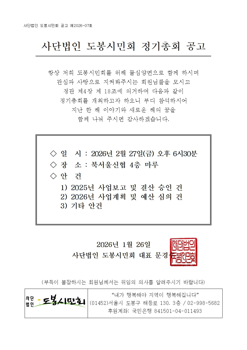 [공지]2026년 총회자료집 및 결산보고합니다. 작성자도봉시민회|작성시간26.03.16|조회수9 목록 댓글 0 글자크기 작게가 글자크기 크게가 도봉시민회2026년정기총회자료집-최최종.pdf4.53MB손익계산서_2026.pdf162.94KB재무상태표_2026.pdf150.11KB 첨부파일첨부된 파일이 5개 있습니다. jpg 파일 KakaoTalk_20260316_150740828.jpg 다운로드 pdf 파일 도봉시민회2026년정기총회자료집-최최종.pdf 다운로드 pdf 파일 손익계산서_2026.pdf 다운로드 pdf 파일 재무상태표_2026.pdf 다운로드 jpg 파일 사단법인 도봉시민회 정기총회 공고 26001.jpg 다운로드 다음검색 현재 게시글 추가 기능 열기 북마크 공유하기 신고 센터로 신고 댓글 댓글 0 댓글쓰기 답글쓰기 댓글 리스트