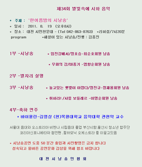 8월 19일(금) 저녁 8시에 대전 시민천문대에서 제가 시낭송합니다. 혹시 시간되시는 분은 아이들 데리고 놀러 오세요 ~~~