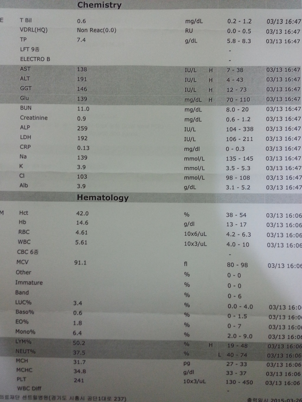작성자다같이 작성시간 15.04.02 afp 가 10 을 넘어 가는군요,,,,,,,앞으로 주지적으로 잘 관찰하세요...아주 중요한 수치 입니다,,갑자기 증가 하시면,,간암종양지표이니,,지속적으로 잘 관찰 하시기 바람니다,,