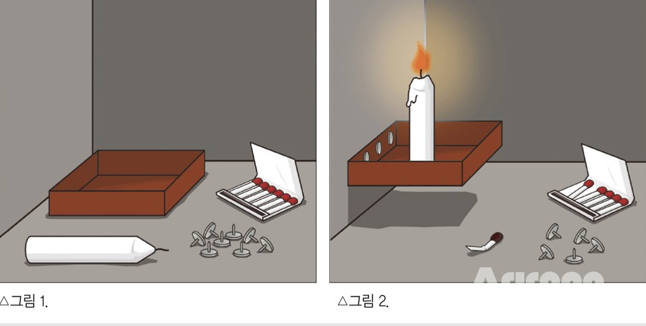 독일의 심리학자 Dr. Karl Duncker는 이와 같은 창의적 문제 해결 능력 평가를 위해 양초 문제를 제시했다. 양초, 상자, 압정, 그리고 성냥을 준 뒤 양초 촛농이 바닥에 떨어지지 않도록 양초를 벽에 고정하라는 과제를 주면 사람들은 어떻게 문제를 해결할까?
