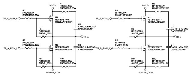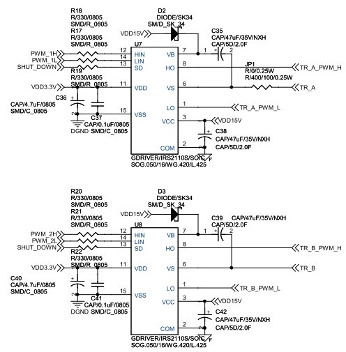 위 회로에서 게이트 드라이버 부분의 GND를 이중(DGND, FGND)으로 사용했는데 이부분을 숏트 시키고 SHUT DOWN핀에 10K옴정도로 풀업, 마이컴 전원 부분을 수정해서 테스트 해보니 안정적으로 동작을 했습니다.