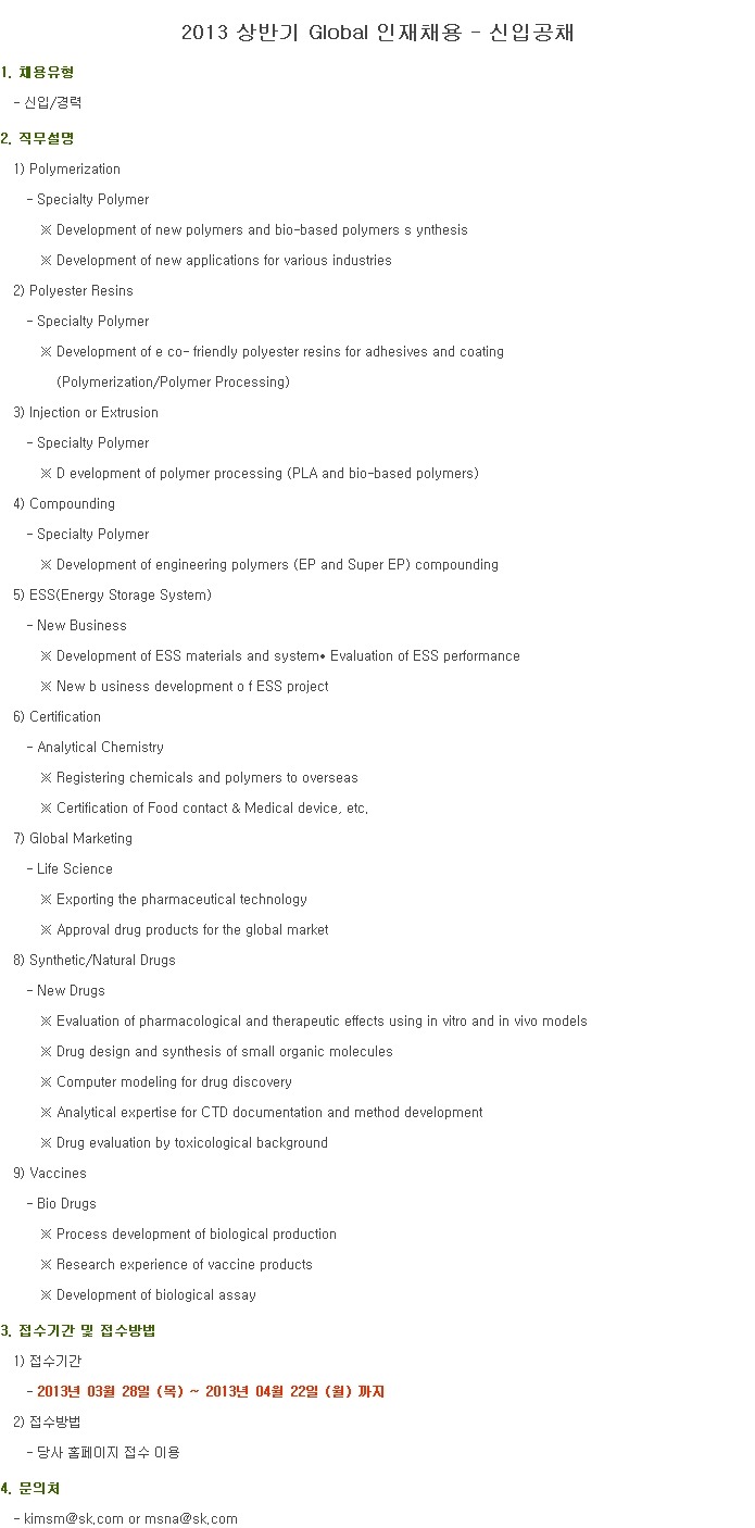 SK케미칼 채용ㅣSK케미칼 2013 상반기 Global 인재채용 공고 및 채용정보 + SK케미칼 연봉정보(~4/22)
