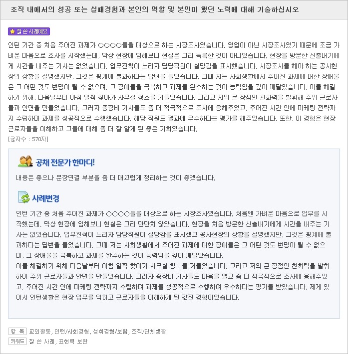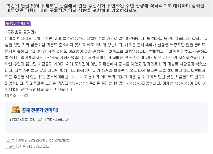 본인의 경험으로 배운점을 잘 표현한 자기소개서 예문이었습니다.