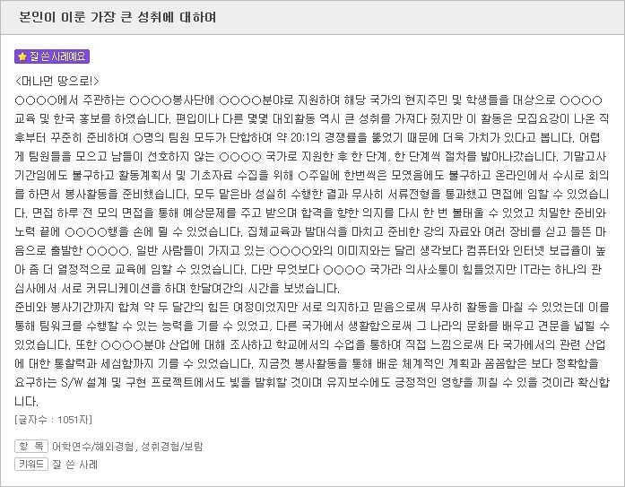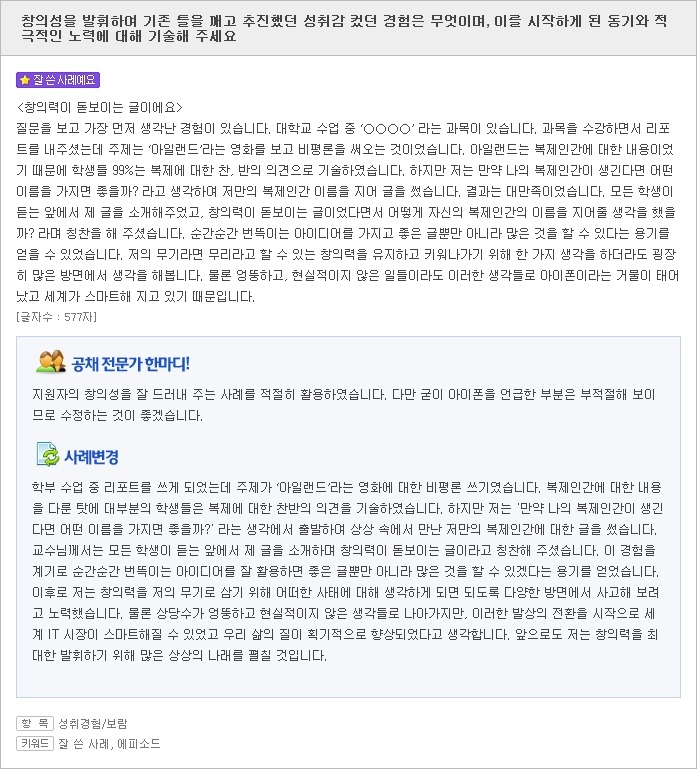 잘 생각해보시고, 자기소개서를 멋지게 작성하시길 바랍니다^^