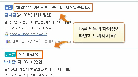 △위의 사진을 보세요, 열람한 이력서 제목과 열람하지 않은 이력서 제목 차이가 나는거 보이시죠?