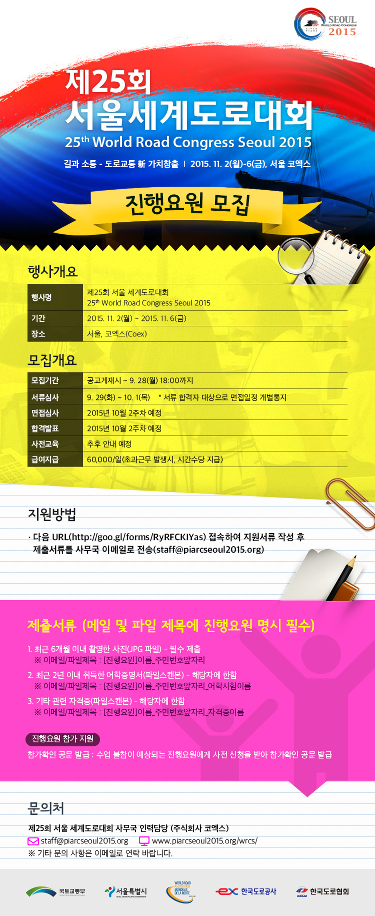 문의처 : 제25회 서울 세계도로대회 사무국 인력담당(주식회사 코엑스)