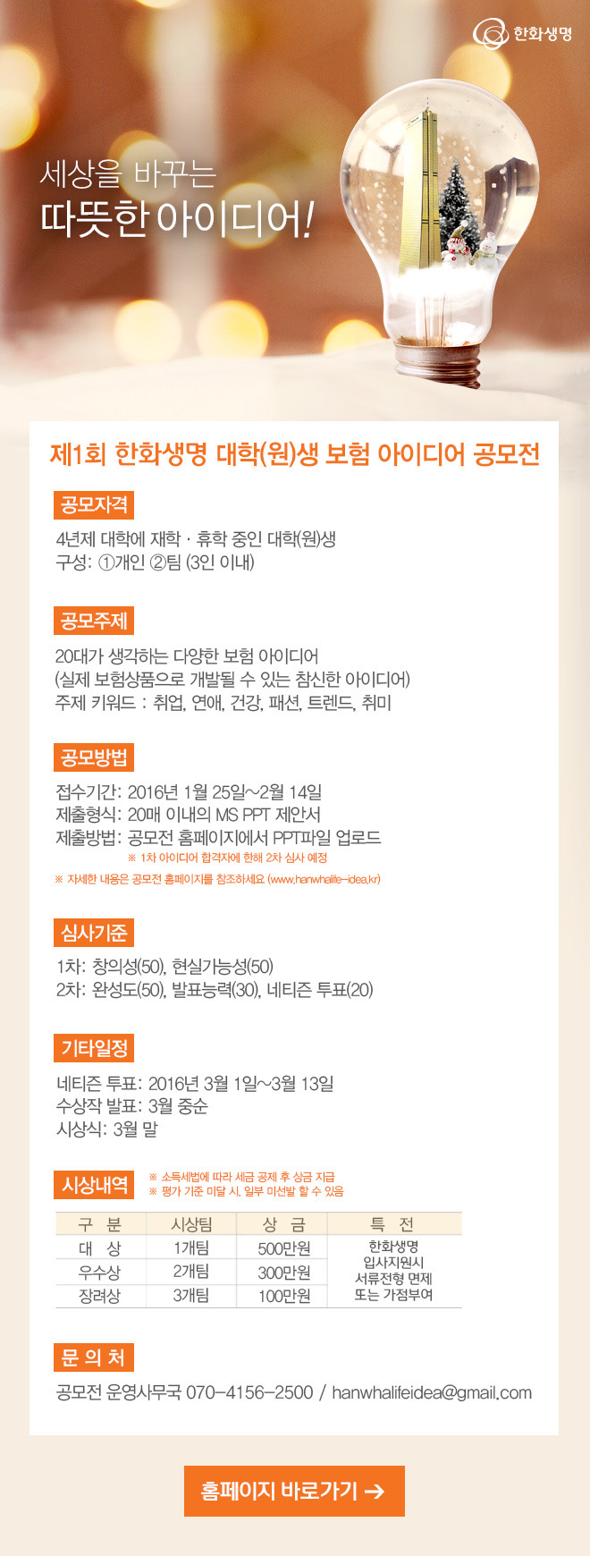 기타사항 | - 공모전 운영사무국 : 070-4156-2500 (운영시간 : 9시 30분 ~ 18시 30분) - hanwhalifeidea@gmail.com |