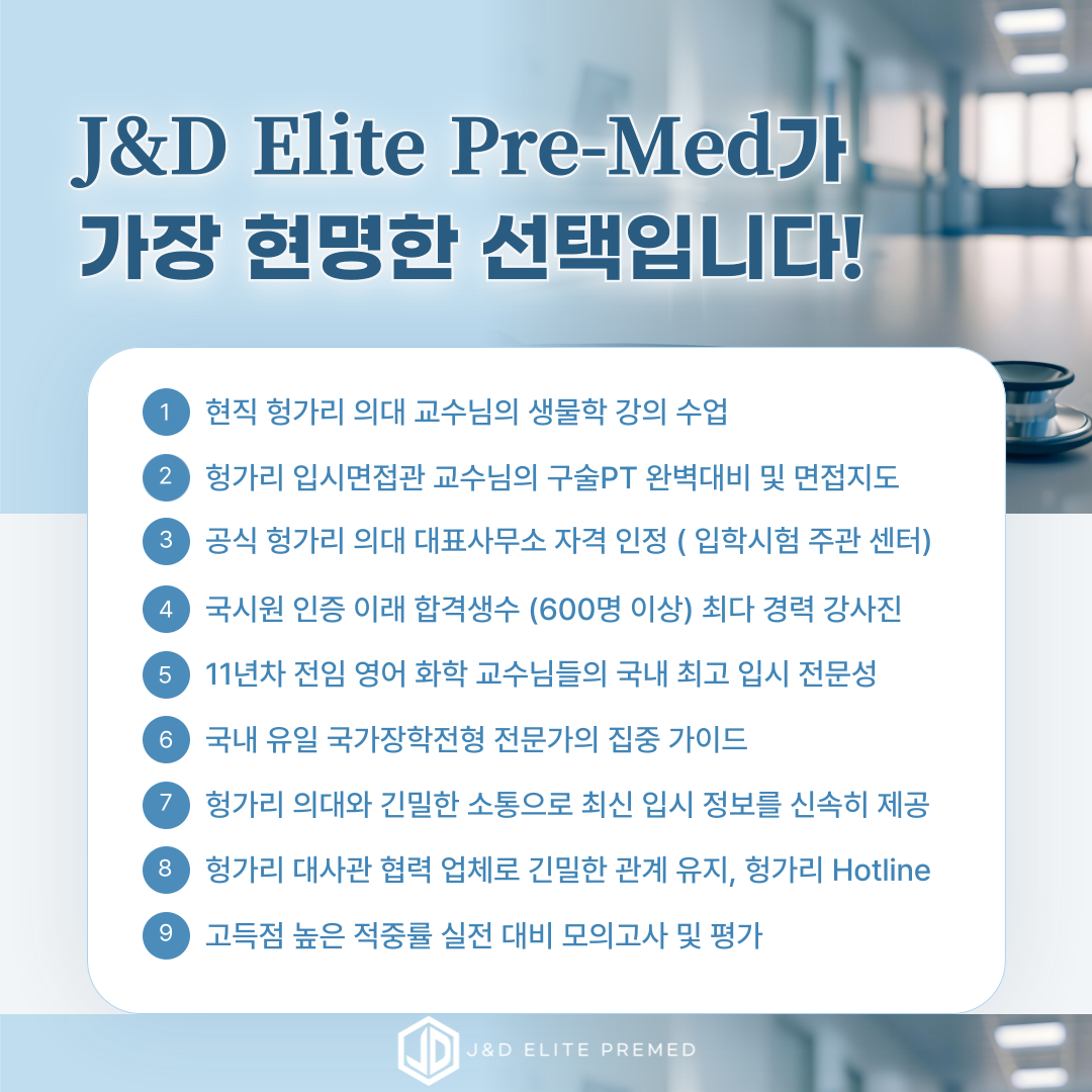 헝가리 의대 입학을 준비하는 학생이라면, 헝가리 의대 입시에 특화된 전문 기관의 도움을 받는 것이 매우 중요합니다. J&D 엘리트 프리메드는 헝가리 의대 입시를 11년 동안 전담해온 경험을 바탕으로 국내 최다 합격자를 배출한 전문 교수진이 학생들을 지도하고 있습니다. 특히 생물 과목의 경우, 헝가리 현직 의대 교수님이 직접 티칭하여 학생들이 실제 입시와 의대 생활에서 필요로 하는 핵심 지식을 습득할 수 있도록 합니다.