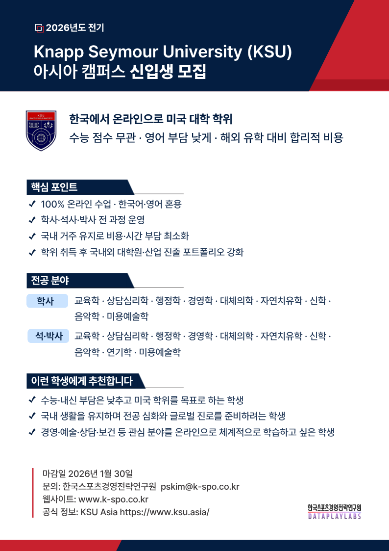 수능 성적이나 공인 영어 점수에 대한 부담 없이 지원이 가능하며, 비싼 학비와 체류비, 각종 자격시험이 필요한 유학에 비해 경제적이고 현실적인 대안이 될 수 있습니다. 특히 스포츠를 좋아해 스포츠데이터분석, 스포츠경영, 스포츠비즈니스 등으로 진로를 설계하고자 하는 학생들에게 KSU는 전공과 진로를 함께 준비할 수 있는 하나의 선택지가 됩니다.