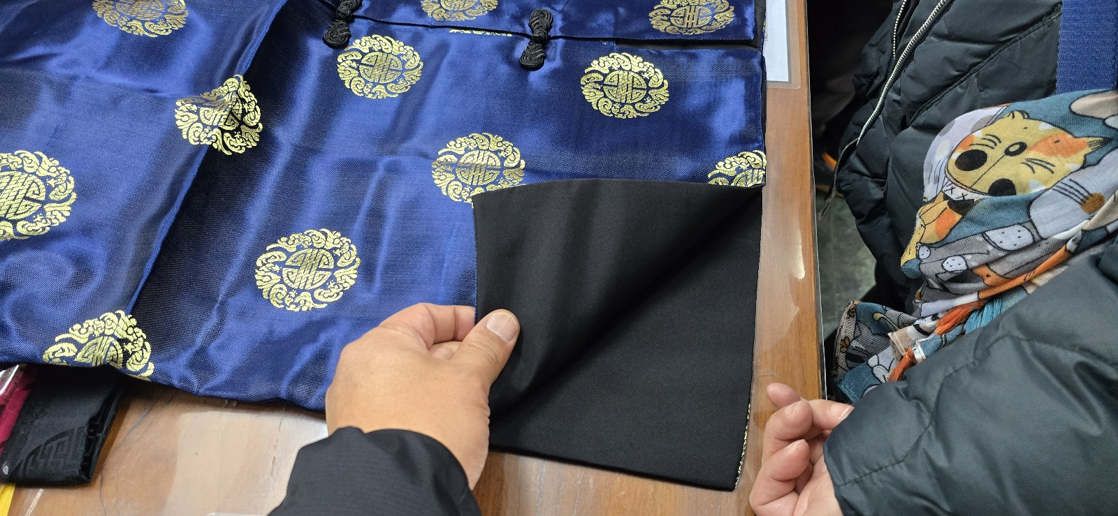 색상이 화려하고 자수 원단이 주를 이루고 있습니다.