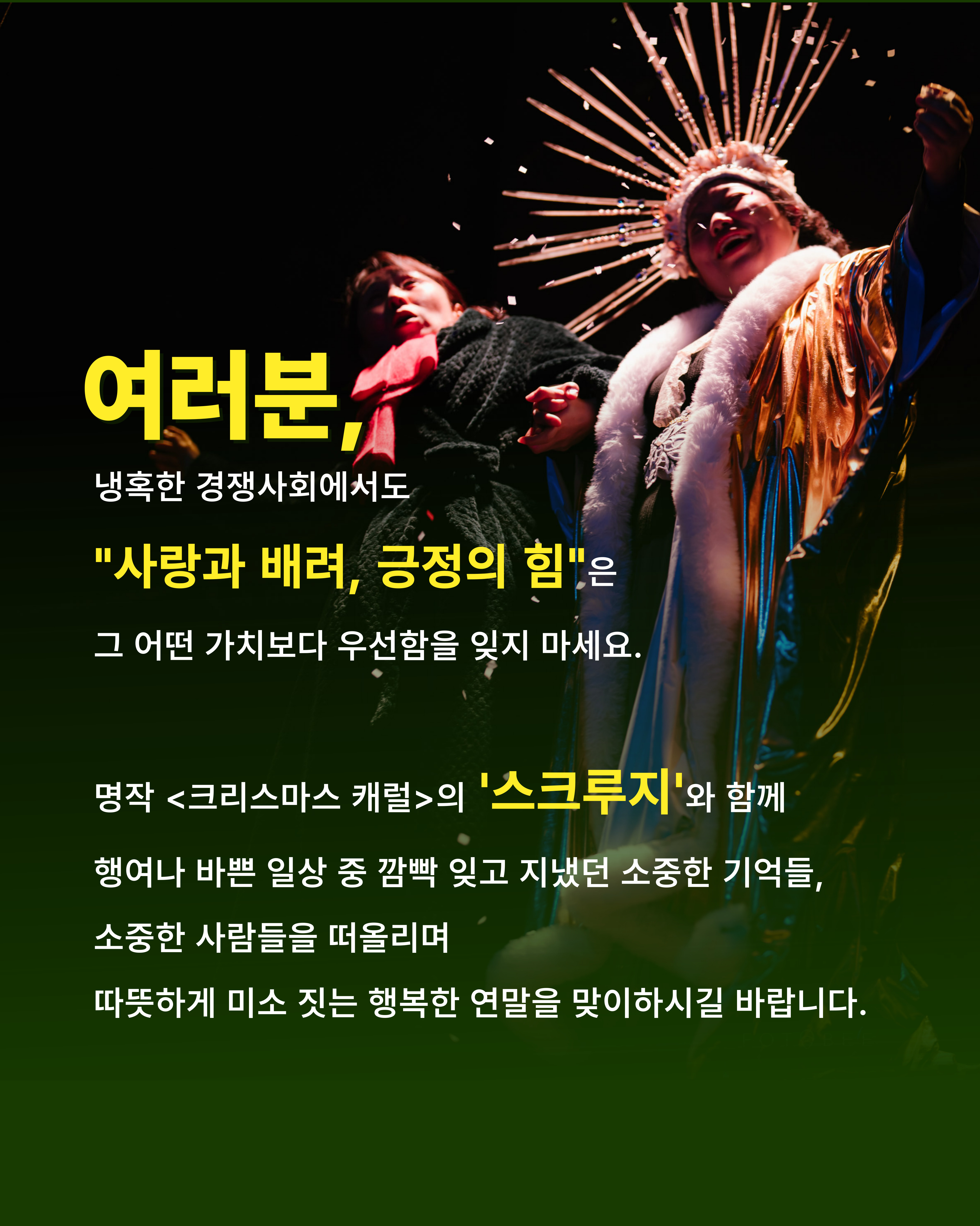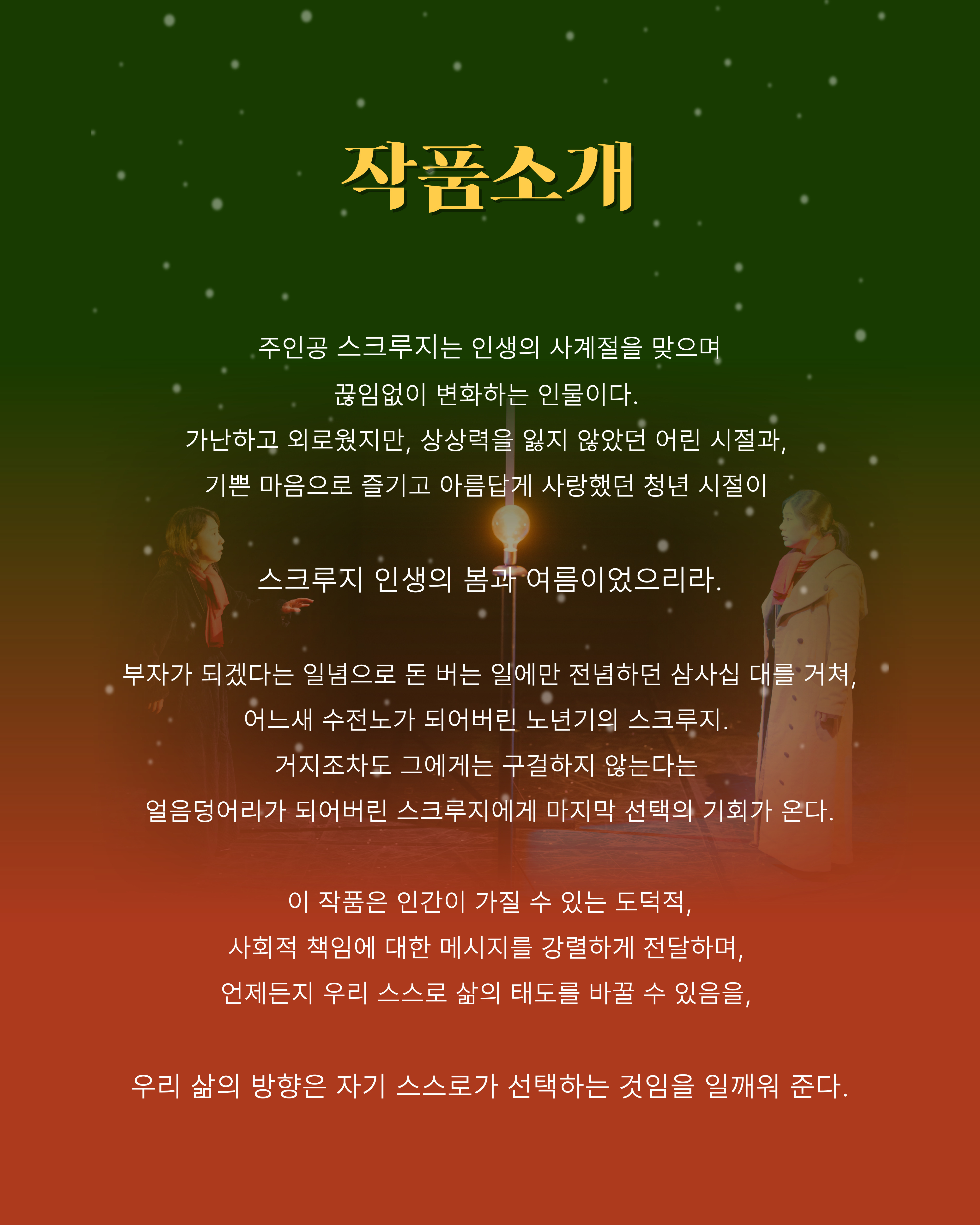 <크리스마스 캐럴>은 가족과 이웃의 소중함, 나눔과 사랑의 가치를 전하는 따뜻한 메시지를 담고 있으며 상상력을 자극하는 다채로운 이미지와 음악이 무대 위에 판타지를 창조합니다.