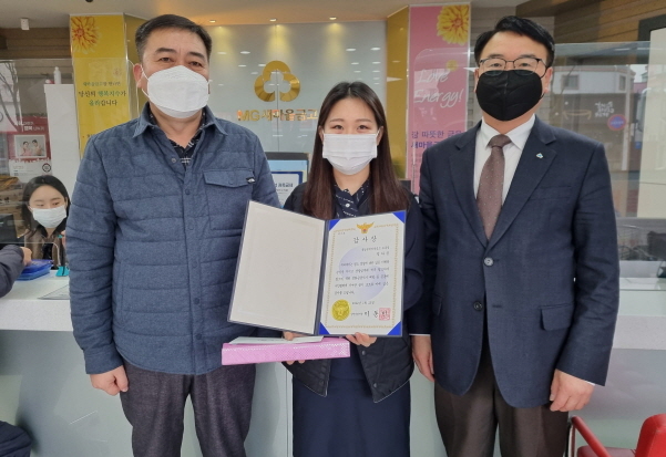 남원경찰서(서장 이동민)은 지난 26일 남원경찰서(서장 이동민)는 남원시 도통동 소재 동남원새마을금고 도통점을 방문하여 보이스피싱을 적극적으로 예방한 은행직원에게 감사장 및 신고포상금을 지급했다.