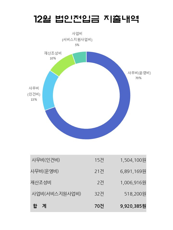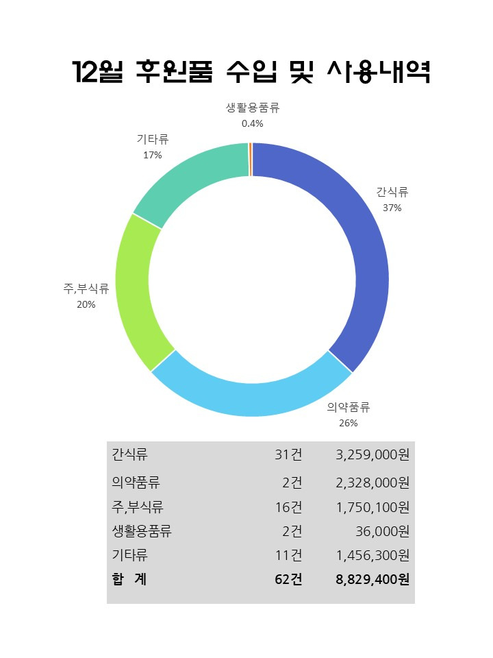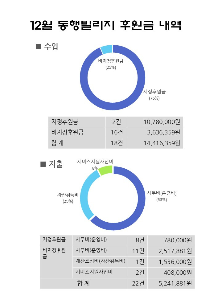 2024년 12월 동행빌리지 후원금품 수입 및 사용내역 보고 작성자동행빌리지|작성시간25.01.07|조회수22 목록 댓글 0 글자크기 작게가 글자크기 크게가 12월에도 동행빌리지와 함께 해 주셔서 감사합니다. 다음검색 현재 게시글 추가 기능 열기 북마크 공유하기 신고 센터로 신고 댓글 댓글 0 댓글쓰기 답글쓰기 댓글 리스트