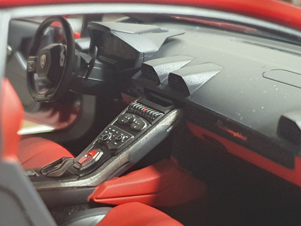 센터 콘솔의 입체적인 토글스위치와 상징적인 레드 스타트 버튼, 그리고 대시보드의 정교한 로고 디테일이 한데 어우러져 오토아트다운 압도적인 내부 디테일을 완성합니다.