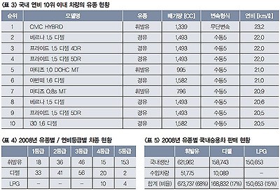 디젤승용차의 연비 우수성은 <표 3>에서와 같이 국내 연비 10위 차종 중 7개가 디젤 차량임을 통해서도 확인 가능하다(유종별 연비등급 <표 4>). 이러한 뛰어난 연비 수준을 기반으로 유럽 시장에서는 2000년대 중반부터 전체 승용 판매 물량의 절반 가량을 디젤 차량이 차지하고 있다. 국내에서 승용디젤 발매 초기 시장의 기대는 매우 높았으나 전체 승용 판매물량의 약 17% 수준이다.