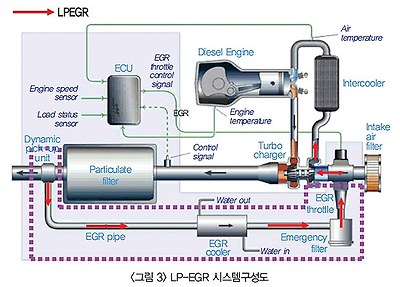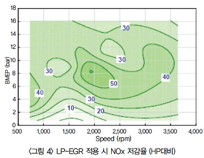 3. 승용디젤 엔진의 연비 기술 승용디젤의 연비 우수성은 앞서 언급한 바와 같이 가솔린대비 높은 열역학적 효율이 가장 크게 기여하고 있다. 특히, 커먼레일 시스템의 도입 이후로는 엔진의 운전조건과 무관하게 연료분사압력/분사시기/파일럿분사 등의 인자를 변화할 수 있게 되어 DOE를 통한 보다 최적화된 연소시스템의 구현이 가능해졌다. 또한, 1,800~2,000bar 이상의 고압, 8개 이상의 분사공을 갖는 분사 시스템 도입은 PM 등 배기가스 저감과 더불어 추가적인 연소 효율 향상을 가능하게 했다. EGR 쿨러의 효율 또한 더욱 높아져서 NOx 부담을 경감시켜주어 연비 개선을 위한 분사 시기 최적화에 기여했다. 특히 NOx 규제강화 대응을 위해 개발된 Low Pressure(LP) EGR 시스템은 뛰어난 NOx 저감 기능으로 인해, 최근에는 연비개선 아이템으로도 검토되고 있다.