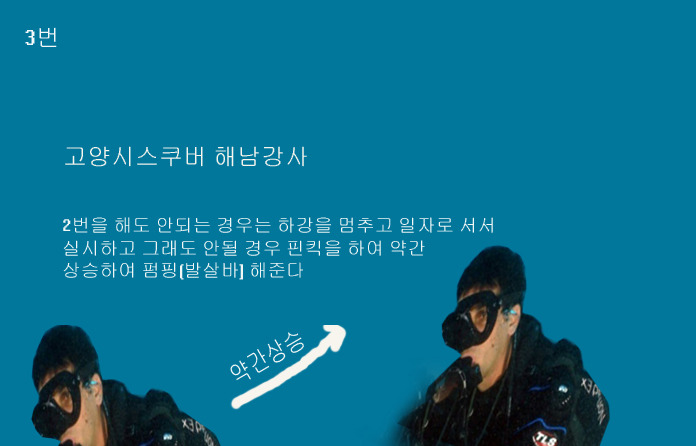 ##압균형(이퀄라이징의 원리)은 압균형의 기차를 미리 출발 시킨다.## 아래 그림은 안되는 귀쪽을 수면으로 향해 놓고 펌핑하는 모습이다.
