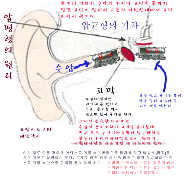 압균형을 잘하는 원리는 압균형의 기차를 내몸에서 미리 출발 시키는 방법이다. -즉 밀려오는 수압 보다 미리 코로 공기를 불어 귀에 넣어 고막이 밀리지 않도록 하는 것이다- 위 도표를 보면 고막 한 장을 두고 두개의 기차가 있다. 공기라는 기차인데 수압에서 밀려온 공기의 기차와 내코에서 발살바를 통해서 밀어 넣는 공기의 기차 모습이다. 마치 제 아무리 미는 기차가 힘이 세더라도 반대쪽에서 미는 기차의 힘이 동일하다면 중간에 종이 한장도 찢어 지지 않는다.<--이것이 압균형 잘하는 다이버의 원리다. *압균형에 도움이 되는 외부 팁 다이빙 전 며칠 동안 금주 전날 귀청소, 코수염 깍기 당일날 오트르빈(약국 7천원) 코에 다이빙 30분 전 코에 뿌리기. |