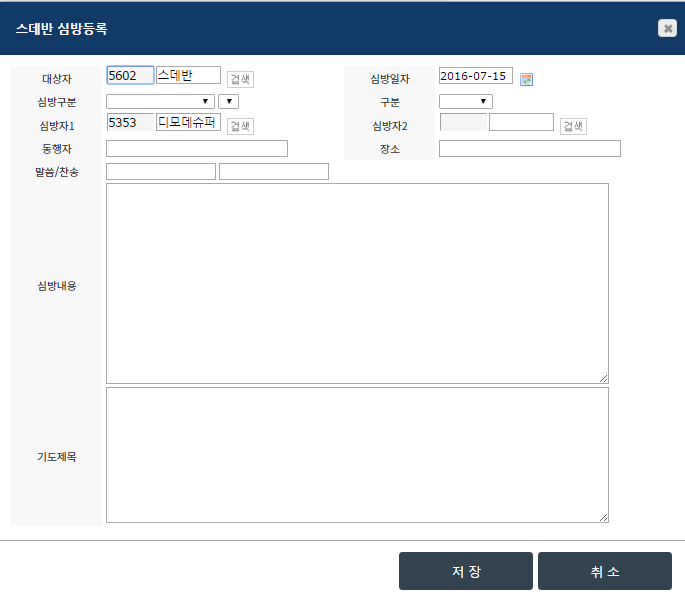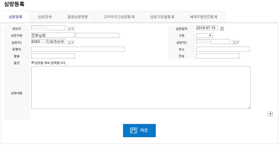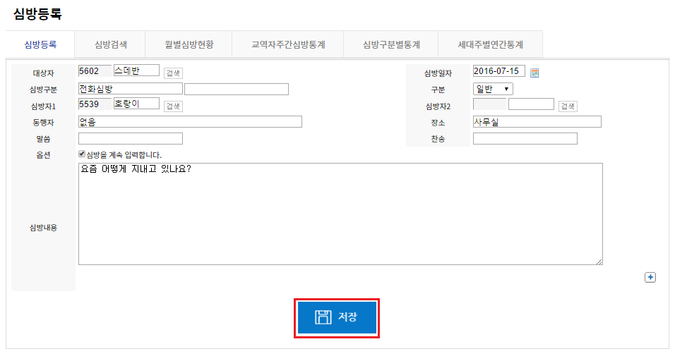 항목을 다 입력하시면 마지막으로 저장을 눌러 심방내용을 저장해주세요.