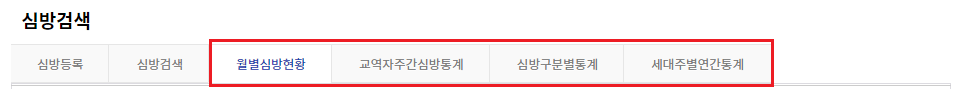 탭을 이동하여 등록한 심방정보를 각각 교역자별, 월별, 심방구분별, 세대주별 통계로 확인하실 수도 있습니다.