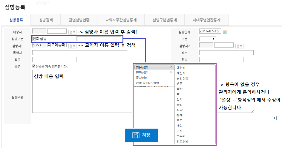 혹시, 심방구분 항목이 없을 경우 관리자에게 문의하시거나 항목정의에서 수정을 해주세요.