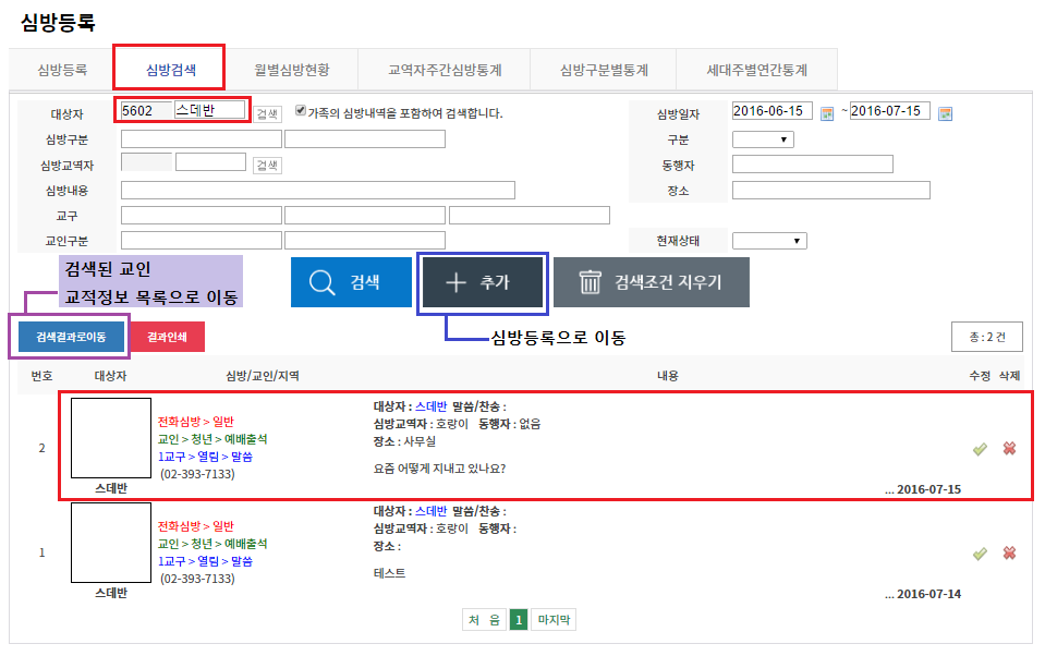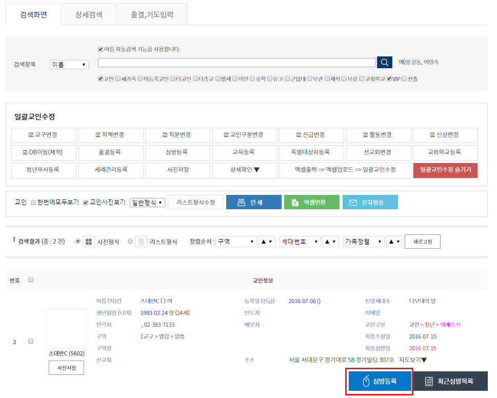 추가로 검색화면에서도 '심방등록'버튼을 눌러서 간단하게 심방을 등록하실 수 있습니다.