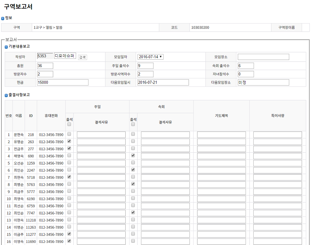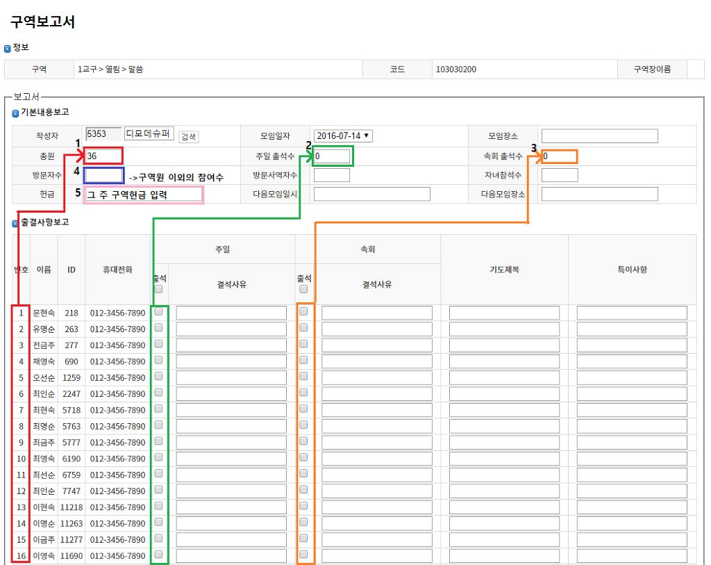 3. 속회출석수 => 주일 출석수와 마찬가지로 속회출석수도 속회 총 출석인원수를 자동으로 입력해줍니다.