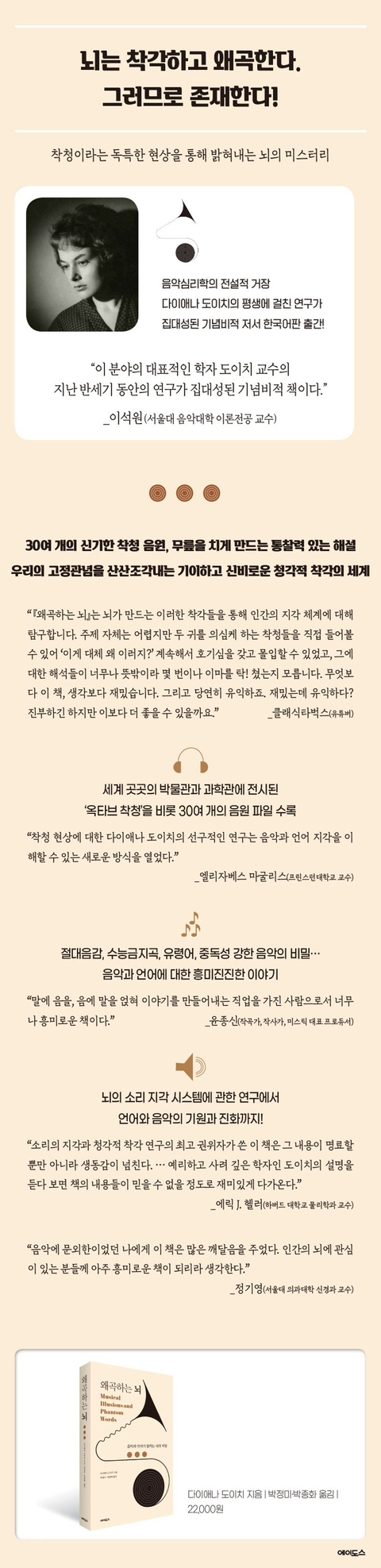 다이애나 도이치는 반세기 넘게 음악심리학을 연구해온 세계적인 연구자이다. 혁신적인 연구 기법을 통해 얻은 흥미로운 연구 결과들로 가득한 이 책은 연구 성과의 정점이라 할 수 있다. … 엄밀하지만 매력적인 스타일로 음악 착청과 유령어를 분명하면서도 재미있게 풀어나간다._마이클 A. 레빈(작곡가)