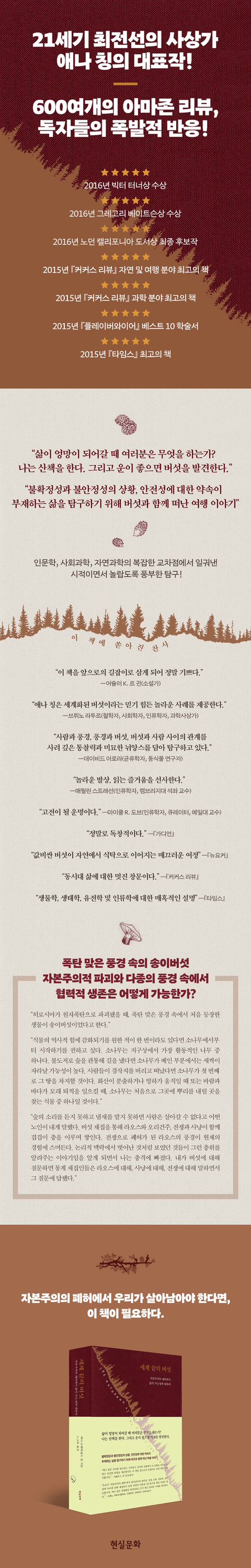 애나 칭은 모험적인 이야기를 엮는다. … 교차하는 문화와 자연의 회복력에 대한 그의 열광적인 설명은 현대성과 진보에 대한 새로운 시각을 제공한다. ―『퍼블리셔 위클리』