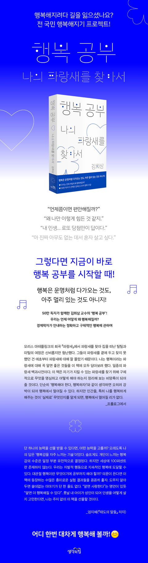 모리스 마테를링크의 희곡 『파랑새』에서 파랑새를 찾아 집을 떠난 틸틸과 미틸의 여정은 신비롭지만 험난했다. 그들이 파랑새를 곁에 두고 찾지 못했던 건 애초부터 파랑새에 대해 잘 몰랐기 때문이다. 나는 행복이라는 파랑새에 대해 꼭 알면 좋은 것들을 이 책에 모두 담아보려 했다. 일종의 파랑새 백과사전이다. 이 책은 자기가 지킬 수 있는 파랑새를 찾기 위해 구체적으로 무엇을 명심하고 어떻게 해야 하는지 정리해 보는 비망록이 되어줄 것이다. 단순히 ‘행복해야 한다, 행복하자!’와 같이 생각하면 오히려 강박이 되어 행복에서 멀어질 수 있다. 하지만 인간을, 특히 나를 행복하게 해주는 것이 ‘실제로’ 무엇인지를 알게 되면, 행복에서 멀어질 리가 없다. _프롤로그 중에서