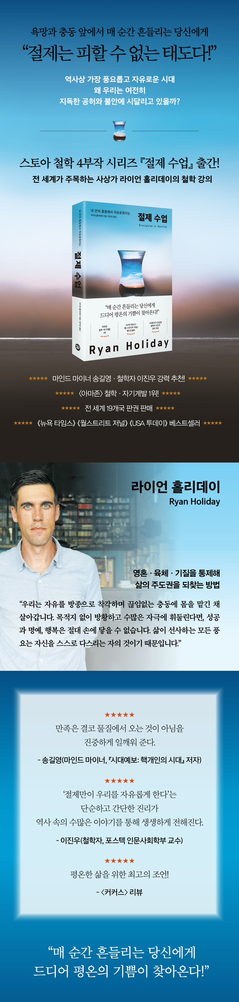 전 세계 40개국 500만 독자의 사랑을 받은 라이언 홀리데이의 신작! 『스토아 수업』, 『데일리 필로소피』, 『브레이브』 등 집필하는 책마다 [뉴욕 타임스] 베스트셀러 목록에 오르는 라이언 홀리데이가 스토아 철학 4부작 시리즈 중 두 번째 책 『절제 수업』을 선보인다. 원하는 것을, 원할 때마다, 원하는 방식으로 갖는 풍요의 시대라지만, 우리는 오히려 욕망과 충동 앞에 매 순간 흔들린다. 『절제 수업』은 너무나 많은 선택지에 갈피를 잡지 못하고 흔들리는 우리에게 자신을 다스려 평온의 기쁨을 되찾는 절제의 법칙을 전한다. 책에서는 인간의 고유한 특성을 육체, 기질, 영혼 세 부분으로 나누고 각 영역에서 ‘절제’를 실현하기 위한 54가지 방법을 소개한다.
