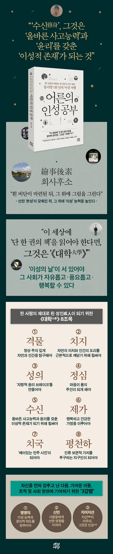 이 책, 『어른의 인성 공부』는 수신·제가·치국·평천하로 통칭 되는 『대학』의 8조목과 3강령을 기본 틀로 해, 고대부터 오늘날에 이르기까지 동서양의 ‘이성’에 대한 여러 통찰을 탐구했다. 물론 그 통찰은 21세기 현재의 정치·경제·문화 환경과 민주주의 시민의 입장에서다.