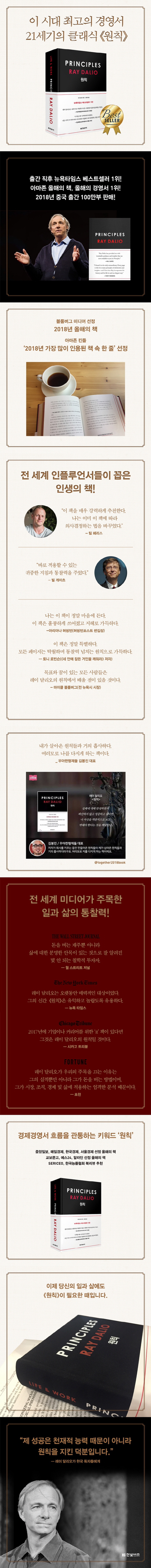 이 시대의 가장 위대한 투자자이자 경영자, 그가 지켜온 원칙은 무엇인가? 이 시대 가장 위대한 투자자이자 기업가인 레이 달리오가 특히 유명한 것은 자신이 세운 원칙을 기반으로 자신의 인생을 살고, 회사를 경영하며, 경제를 예측하고 투자하기 때문이다. 그의 원칙을 담은 첫 저서 《원칙》은 2017년 9월 미국에서 출간된 직후 종이책만 35만 부가 팔리며 뉴욕타임스 베스트셀러 1위, 아마존 선정 올해의 Best Business & Leadership title에 선정되었다. 출간 직후부터 현재까지 아마존 베스트셀러에 올라 있으며 전 세계에 판권이 계약되었다. 올해 1월에 중국에서 번역서가 출간된 후 베스트셀러 순위 1위에 오르며 100만 부가 판매되었고, 중국 본토에 레이 달리오 열풍을 불러왔다.