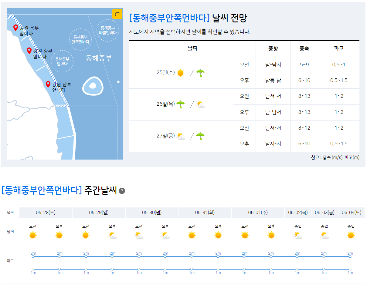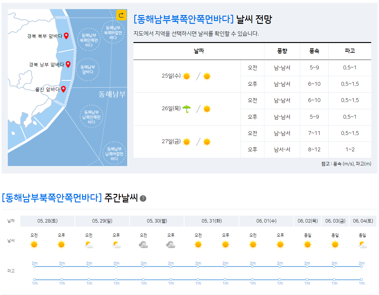 (해상) 모레(27일) 밤부터 동해남부먼바다에는 바람이 25~50km/h(7~14m/s)로 강하게 불고 물결이 1.5~2.5m로 높게 일겠고, 오늘(25일) 오후부터 밤 사이 서해중부해상, 내일(26일) 새벽에 동해중부해상에는 돌풍과 천둥.번개가 치는 곳이 있겠으니 항해나 조업하는 선박은 각별히 유의하기 바랍니다.