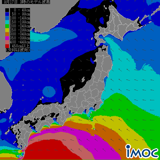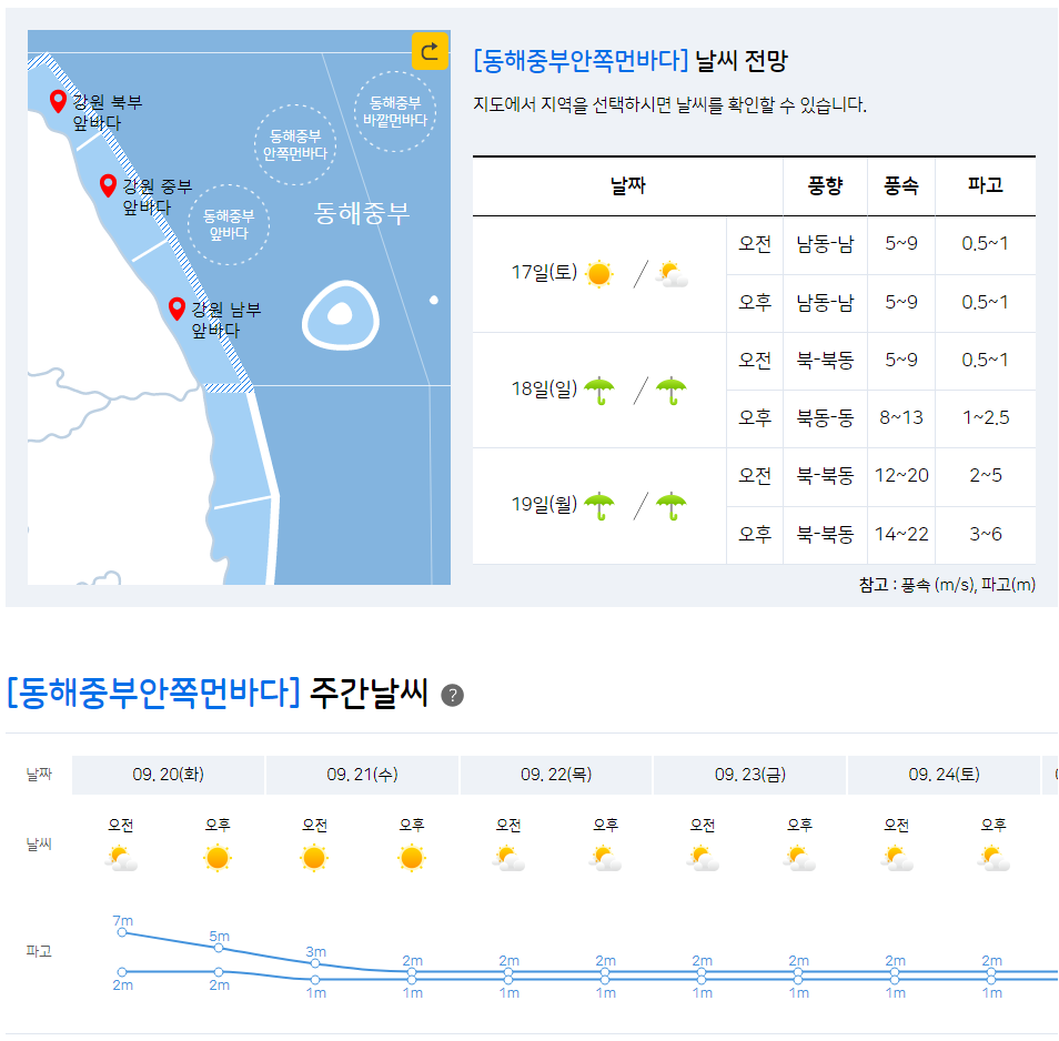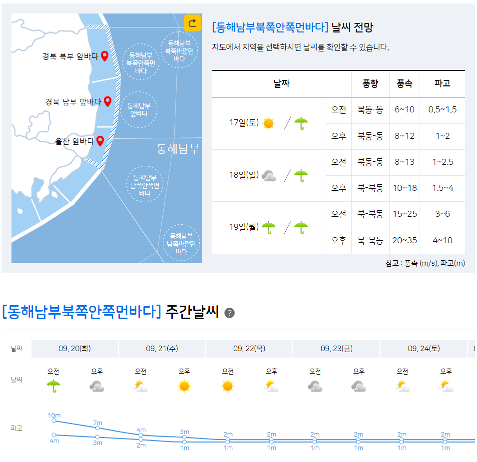 (해상) 풍랑특보가 발표된 제주도남쪽바깥먼바다를 시작으로 오늘(17일) 아침부터 남해동부바깥먼바다, 오늘 오후부터 그 밖의 제주도해상과 남해동부안쪽먼바다, 내일(18일)부터 그 밖의 남해상과 서해상, 동해남부해상, 모레(19일)부터 동해중부해상에도 바람이 35~110km/h(10~30m/s)(남해동부먼바다와 동해남부남쪽먼바다, 제주도남쪽먼바다 최대 145km/h(40m/s) 이상)로 매우 강하게 불고, 물결이 2.0~7.0m(내일 남해동부먼바다와 제주도남쪽먼바다, 모레 동해남부먼바다 최대 10.0m 이상)로 매우 높게 일겠습니다.