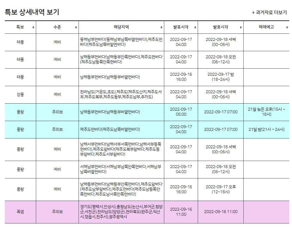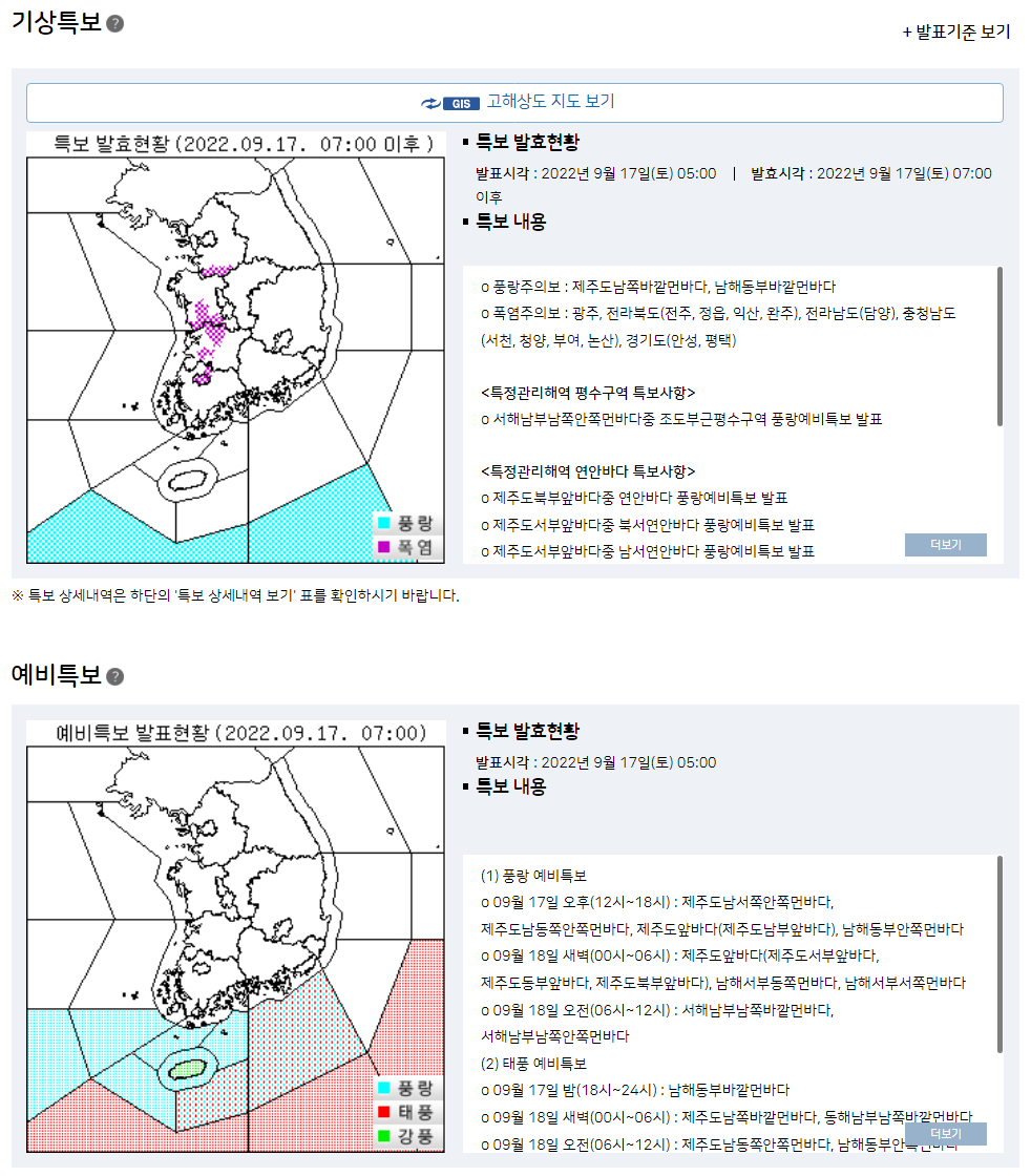 [스크랩] 2022년 9월 17일(토요일) 10:00 현재 대한민국 날씨정보 및 기상특보 발표현황 (울릉도, 독도 포함 - 기상청발표)
