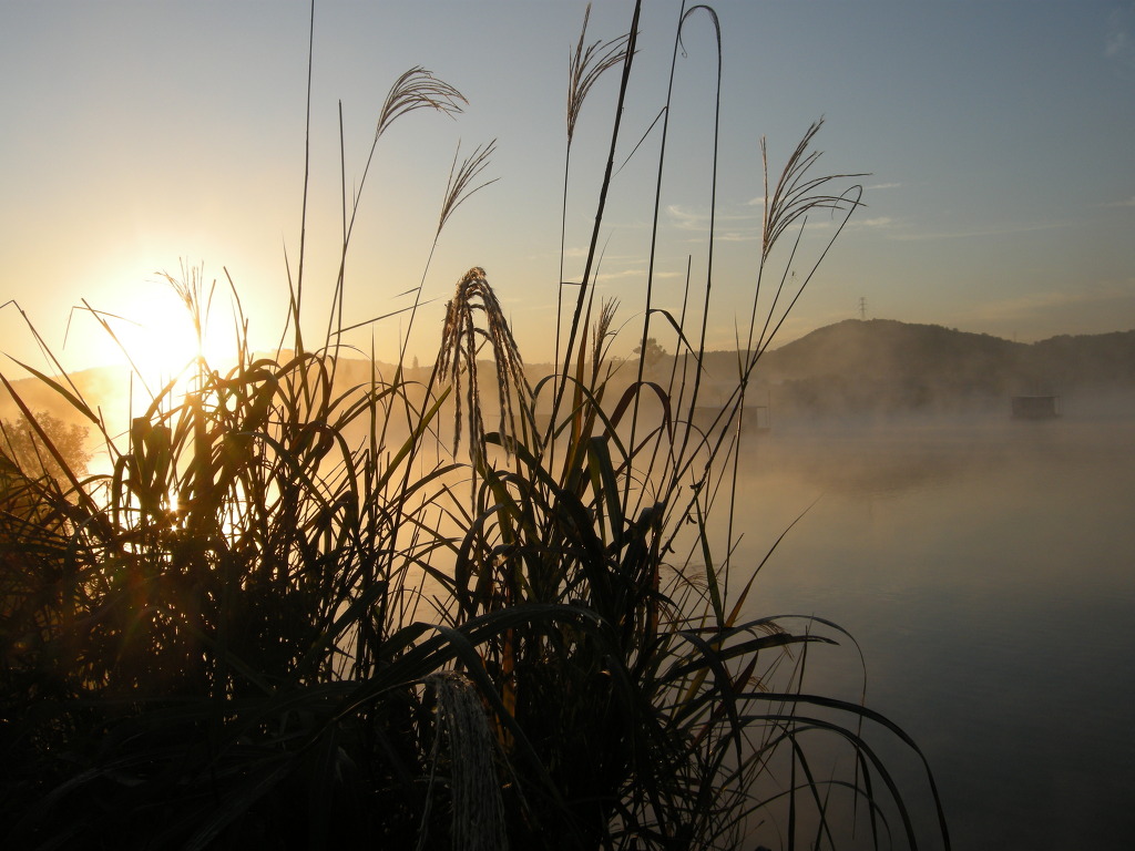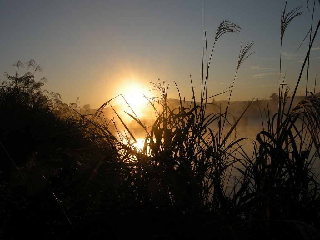 낚시포인트 옆 갈대 사이로 해가 떠오릅니다.