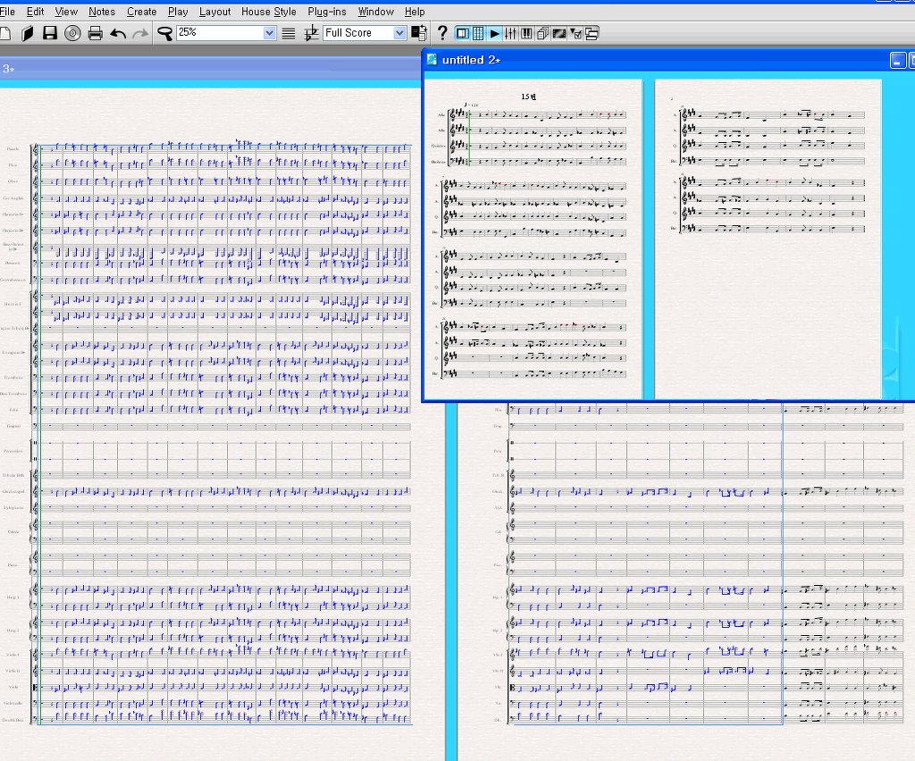시벨리우스 윈도우에서 cascad로 선택 화면을 둘로 띠우고 화면 크기를 줄여서