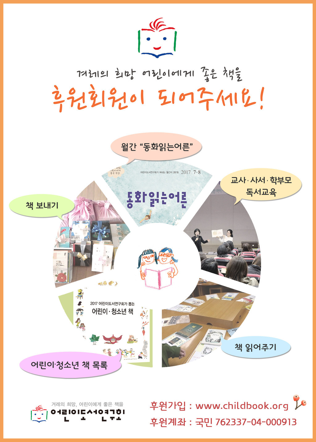 후원회원이 되시면 회에서 매년 발간되는 어린이 청소년 책 목록과 매달 발간되는 동화읽는어른을 받아보실 수 있으며, 회에서 진행되는 각종 행사와 교육에 참여하실 수 있습니다. 가입을 원하시는 분은 www.childbook.org 에 가시거나, 비밀 덧글로 연락처를 남겨주시면 연락을 드리겠습니다.