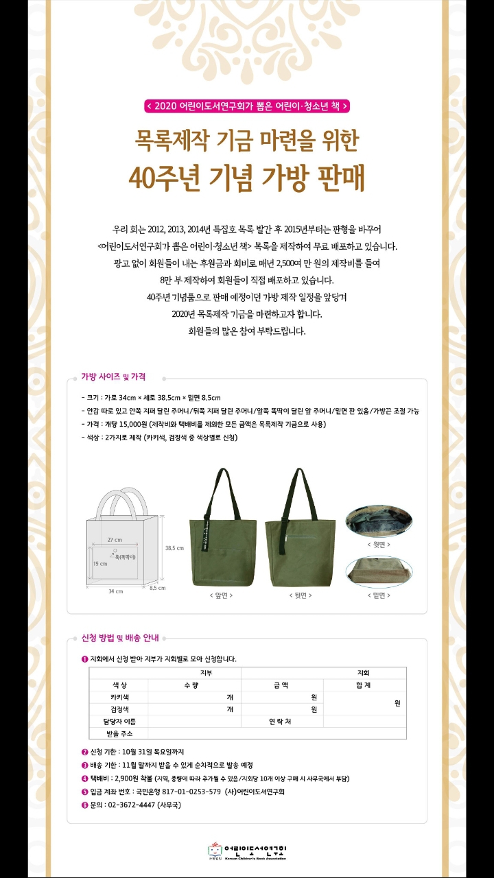 40주년 기념 가방 판매 작성자강지혜(지회장)|작성시간19.10.07|조회수52 목록 댓글 0 글자크기 작게가 글자크기 크게가 목록제작 기금마련 40주년 기념 가방을 판매합니다. 9월 29일까지 부서별로 취합부탁합니다. 다음검색 현재 게시글 추가 기능 열기 북마크 공유하기 신고 센터로 신고 댓글 댓글 0 댓글쓰기 답글쓰기 댓글 리스트