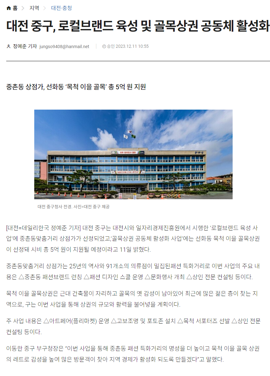 대전 중구, 로컬브랜드 육성 및 골목상권 공동체 활성화 사업 공모 선정 작성자임지선|작성시간23.12.11|조회수26 목록 댓글 0 글자크기 작게가 글자크기 크게가 https://daily.hankooki.com/news/articleView.html?idxno=1029738대전 중구, 로컬브랜드 육성 및 골목상권 공동체 활성화 사업 공모 선정 - 데일리한국[대전=데일리한국 정예준 기자] 대전 중구는 대전시와 일자리경제진흥원에서 시행한 ‘로컬브랜드 육성 사업’에 중촌동맞춤거리 상점가가 선정되었고,‘골목상권 공동체 활성화 사업’에는 daily.hankooki.com 다음검색 현재 게시글 추가 기능 열기 북마크 공유하기 신고 센터로 신고 댓글 댓글 0 댓글쓰기 답글쓰기 댓글 리스트