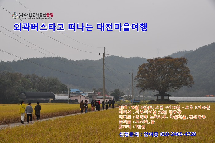 # 코스 : 서부버스터미널 23번 정류장(9:30) - 원정동 종점(10:20) - 세편이마을(10:50) - 정방이마을 - 야실마을과 독선거리 소나무 - 점심(12:00) - 유천동마을 - 흑석유원지 - 버스탑승 - 서부버스터미널 정류장(14:30)